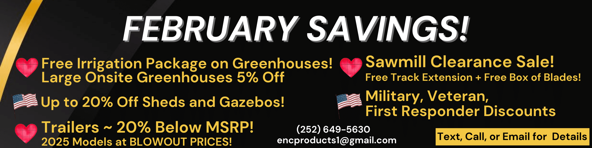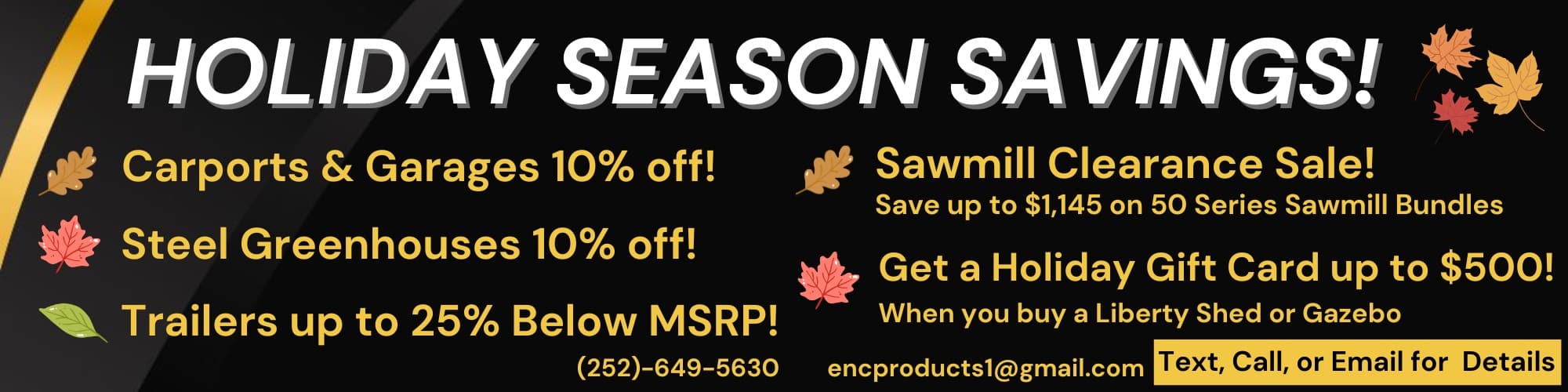 Mickey BakerTrustindex verifies that the original source of the review is Google. Just bought 7x14 enclosed trailer from these guys. Awsome staff great deal on trailer.I highly recommend doing buisness with these guys . Great to see local business doing good things Howard HeinTrustindex verifies that the original source of the review is Google. This was a great experience from design, to order, to delivery. ENC Products are very customer focused, and delivery team was awesome. Setup was quick and easy. They have the right tools and talent to do it right!!. Definitely recommend this dealer and the product. Mary HaynesTrustindex verifies that the original source of the review is Google. Liberty sheds was great. They communicated throughout the process. The gentleman who delivered and set it up was awesome. He took care with my property, made sure everything was perfect before he left. I highly recommend them for your shed! Candy AlexanderTrustindex verifies that the original source of the review is Google. They were so helpful and very nice.took the time and went over everything about the machine with us and helped load it in the rain Great people. Thank you again Allen PorterTrustindex verifies that the original source of the review is Google. Shed was delivered ahead of schedule and installed exactly where I wanted it. Fast and easy. Well organized and responsive. Not something you commonly see these days. I would highly recommend. Martha NewmanTrustindex verifies that the original source of the review is Google. Doug and Ryan at ENC were professional, knowledgeable, and helpful. We highly recommend them and will definitely be back for our next project! Drew TurnerTrustindex verifies that the original source of the review is Google. ENC Products/Doug has been a great company to deal with. Doug was quick to solve any problems that I came across with my sawmill. I would definitely recommend and do business with them again. Mike WestoverTrustindex verifies that the original source of the review is Google. Great people here!!! I highly recommend this place!! The level of professionalism and courtesy is amazing!! If you get a chance stop by and check them out before you buy anywhere else. We will definitely be return customers. Thanks again and our trailer sure will come in handy. Terri WelchTrustindex verifies that the original source of the review is Google. I cannot say enough about the EXCELLENT customer service that was provided. They worked with us on EVERYTHING we needed and we are extremely satisfied with them! Highly recommend!!!! Josh FerrisTrustindex verifies that the original source of the review is Google. I recently had the pleasure of interacting with Ryan at ENC Products & Services, and I must say his knowledge is unparalleled. He answered every question I had with precision and clarity, demonstrating a deep understanding of the products. I highly recommend seeking out Ryan's assistance for any queries or guidance you might need. Top-notch service!